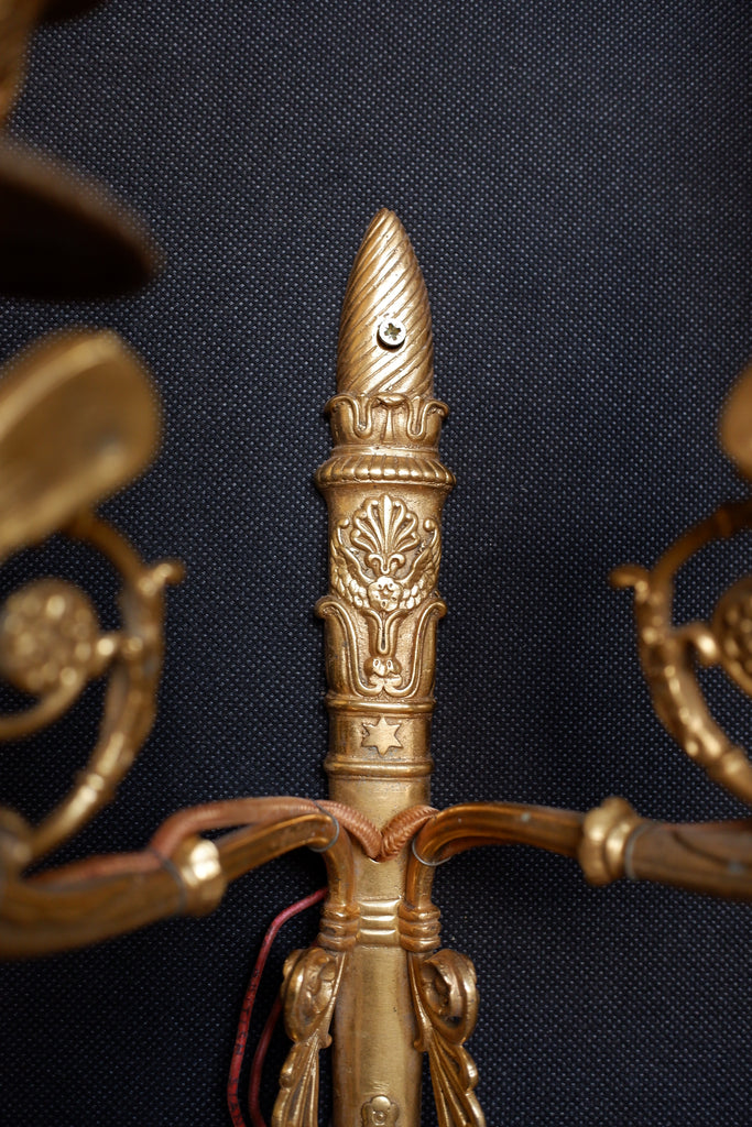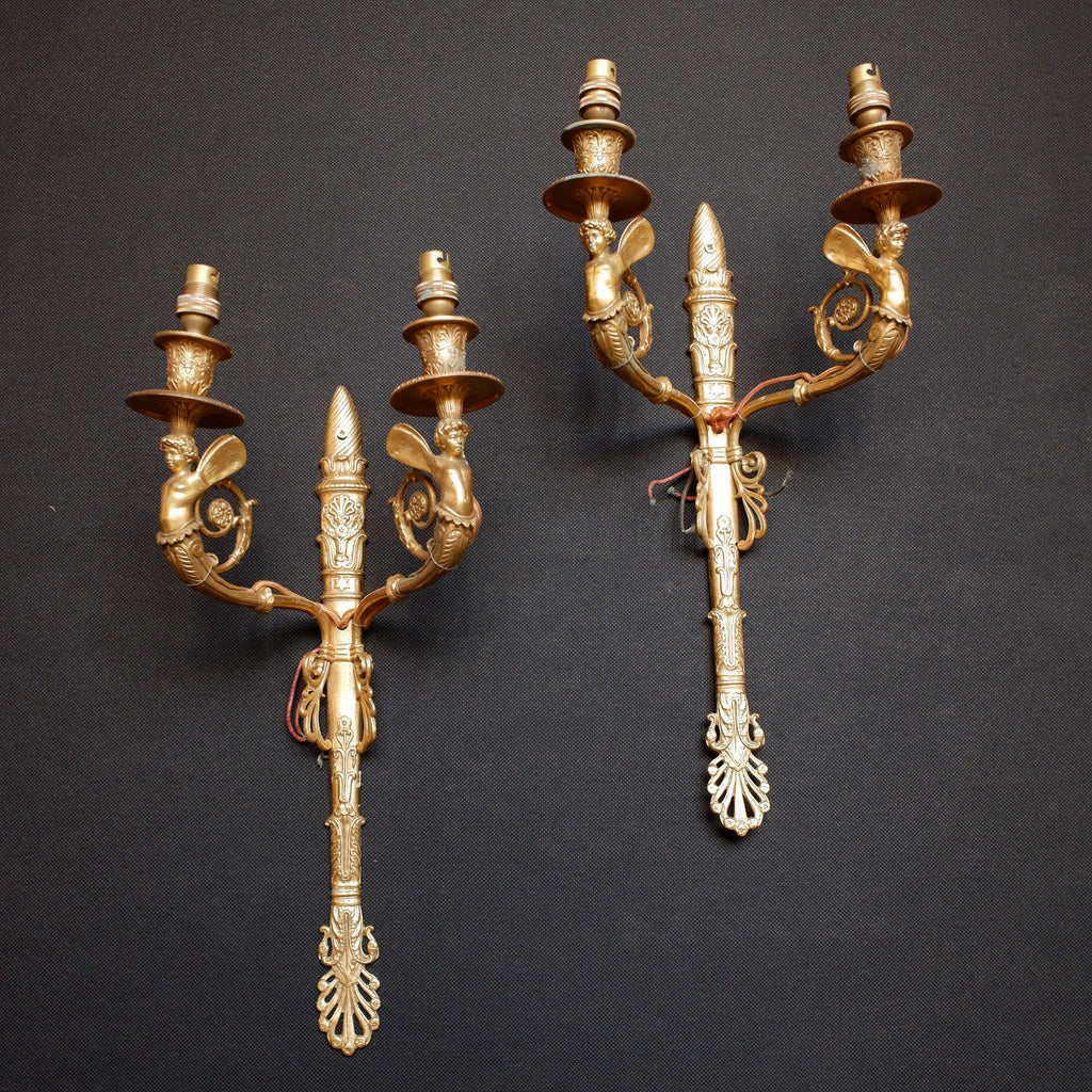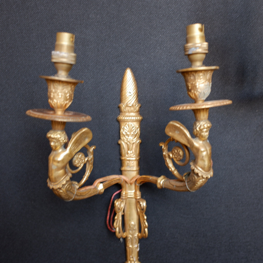 Pair of Antique French Gilt Brass Ornate Cherub Double Arm Wall Lights