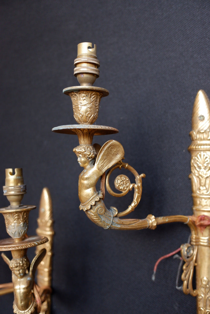 A fabulous pair of French wall lights in the Louis style, adorned with cherubs on each arm with beautiful scrolled ornate detail throughout. These are sturdy gilt brass lights in a luxury gold finish showing it's age.