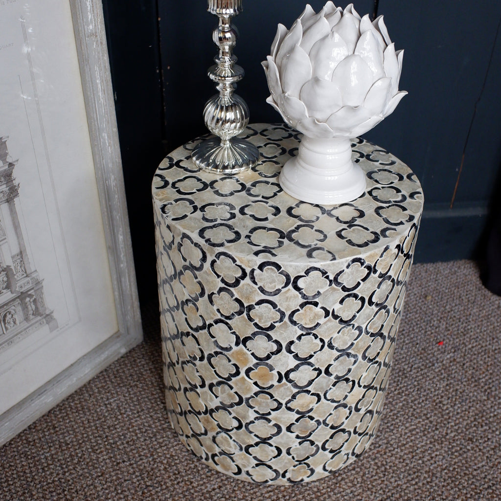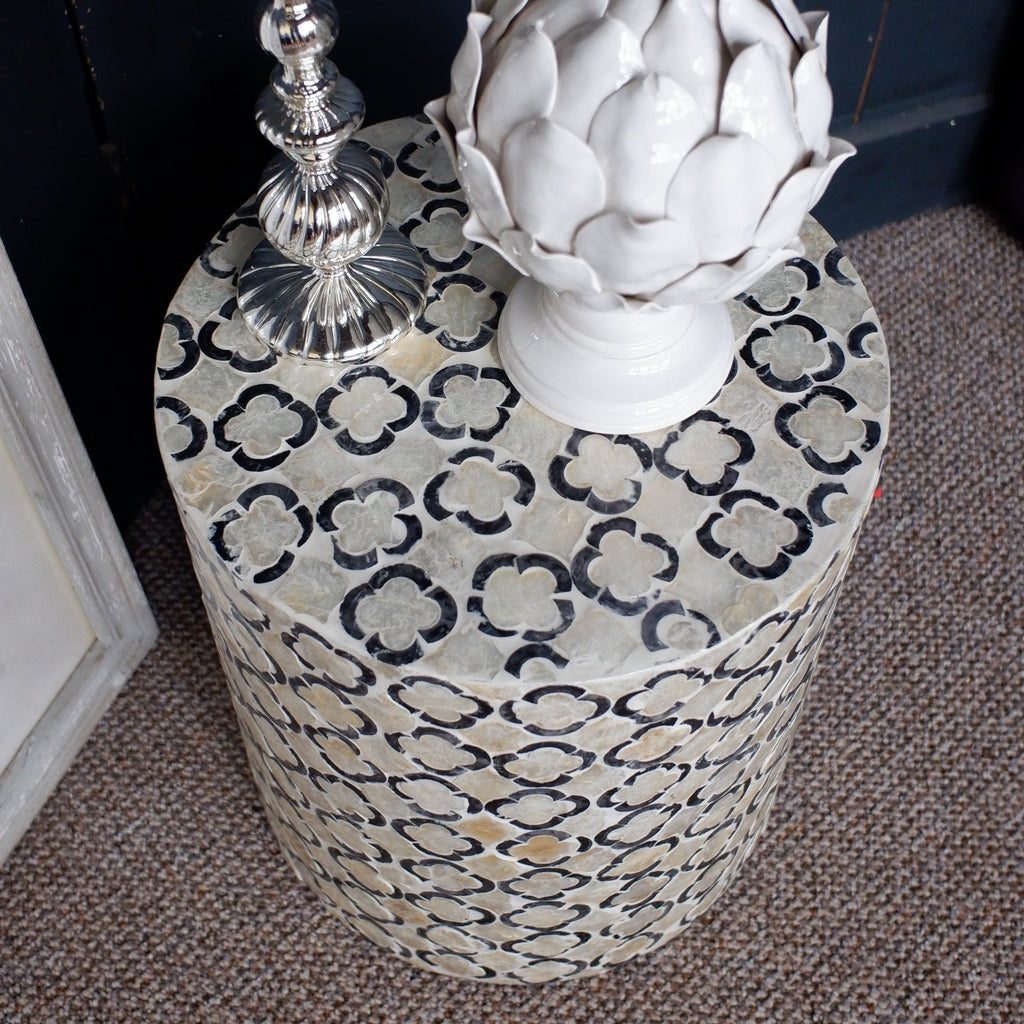 Black & White Round Drum Table Inlaid Mother of Pearl Modern Stand Stool