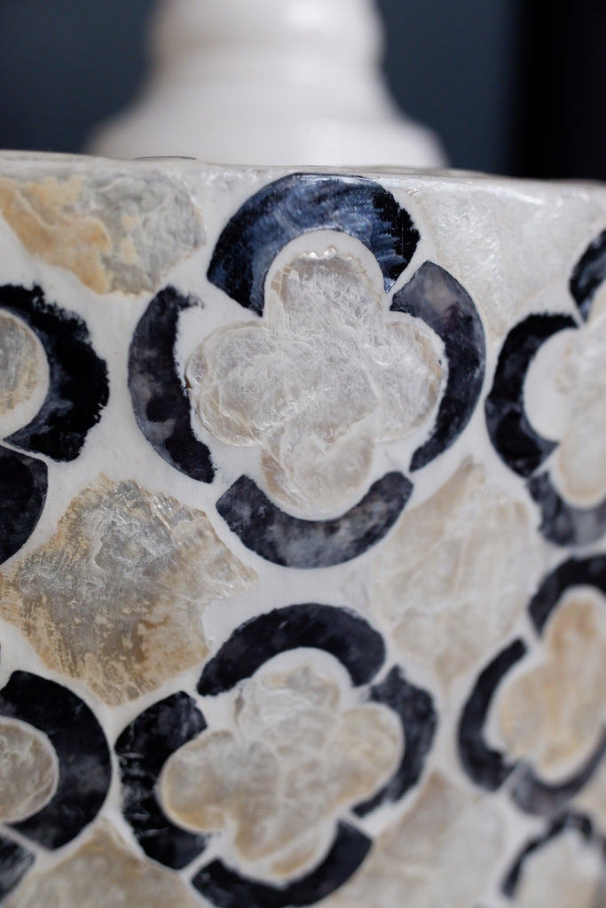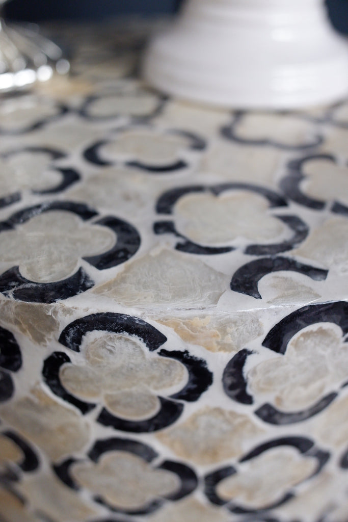 Elevate your living space with this modern black and white round drum table, exquisitely inlaid with mother of pearl in a four leaf clover shape with subtle hints of shimmer. Its sleek design blends contemporary style with artisanal craftsmanship, making it an ideal accent piece or versatile stand, stool. Perfect for adding understated elegance to any room, this side table offers both functional surface area and distinctive visual interest.