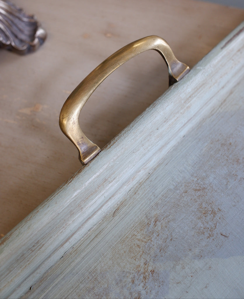 An elegant antique Edwardian wooden tray in walnut with brass handles, painted in a subtle chequer board harlequin design with pale green colours in a rustic distressed finish. This is a large rectangular tray with slight damage to one corner, otherwise a sturdy piece. Perfect as a display or serving tray adding a little character and charm.