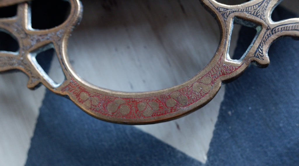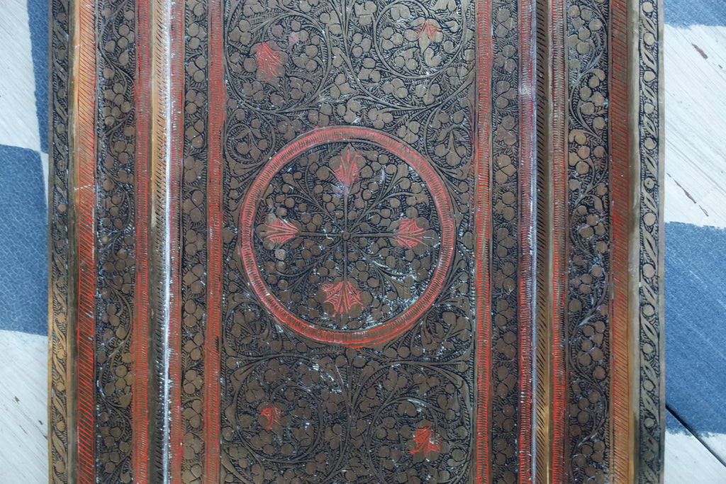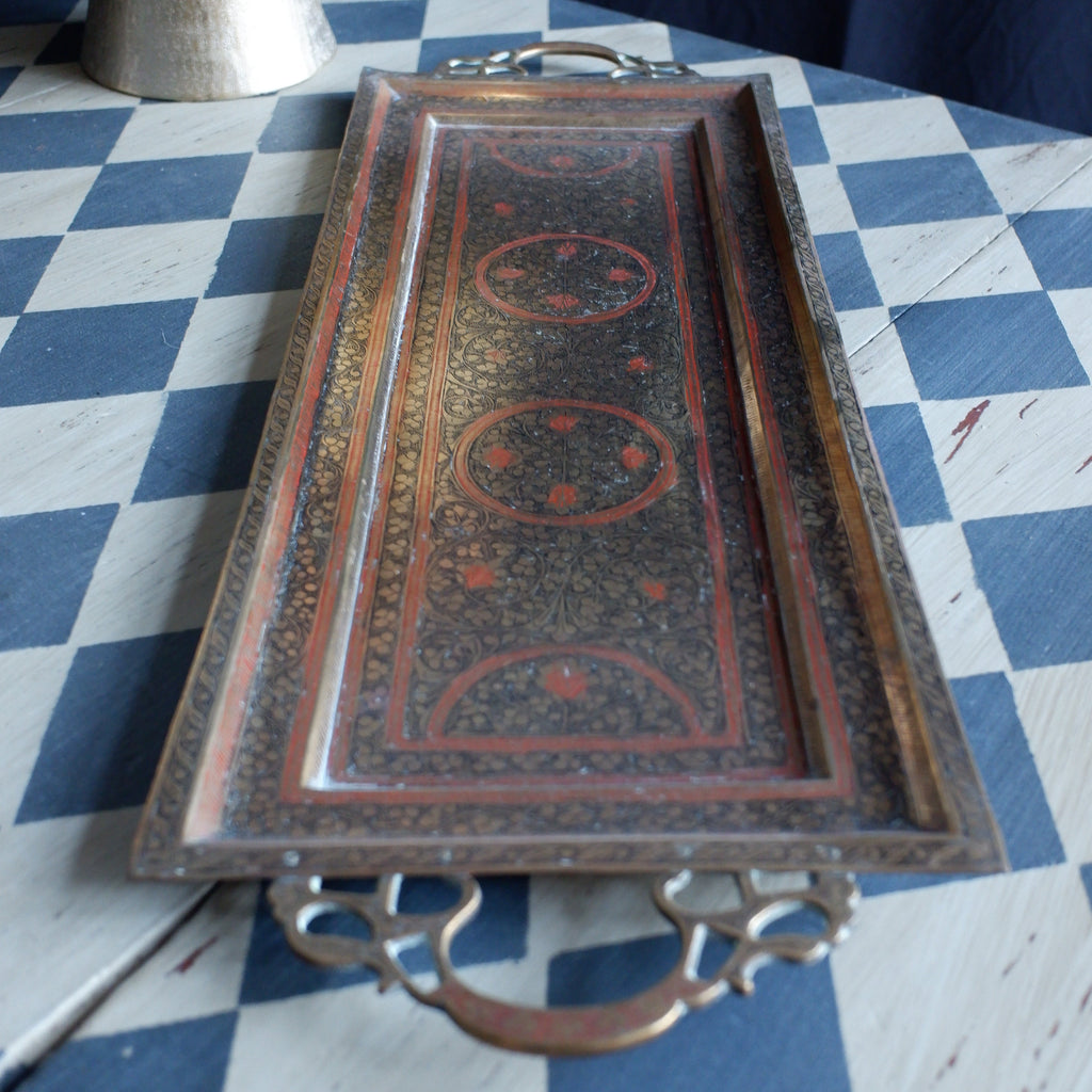 This rectangular brass tray brings authentic Indian artistry into your home. This is hand painted enamelled in red and black with traditional patterns, creating intricate designs across the surface. The solid brass construction develops a rich patina with age, adding to its warm character and rustic charm. Use it for serving tea and refreshments, displaying decorative objects, or as a striking wall accent.