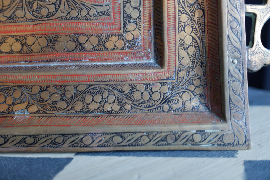 Antique Brass Indian Etched Serving Tray Decorative Metal Rectangular Display