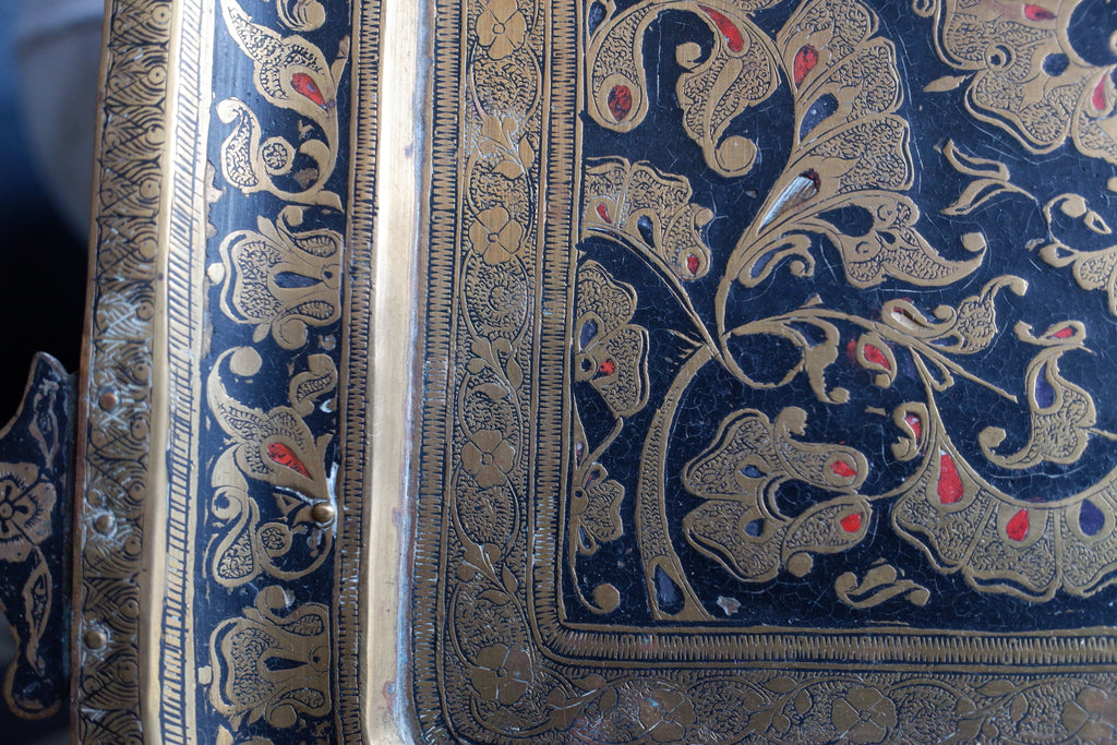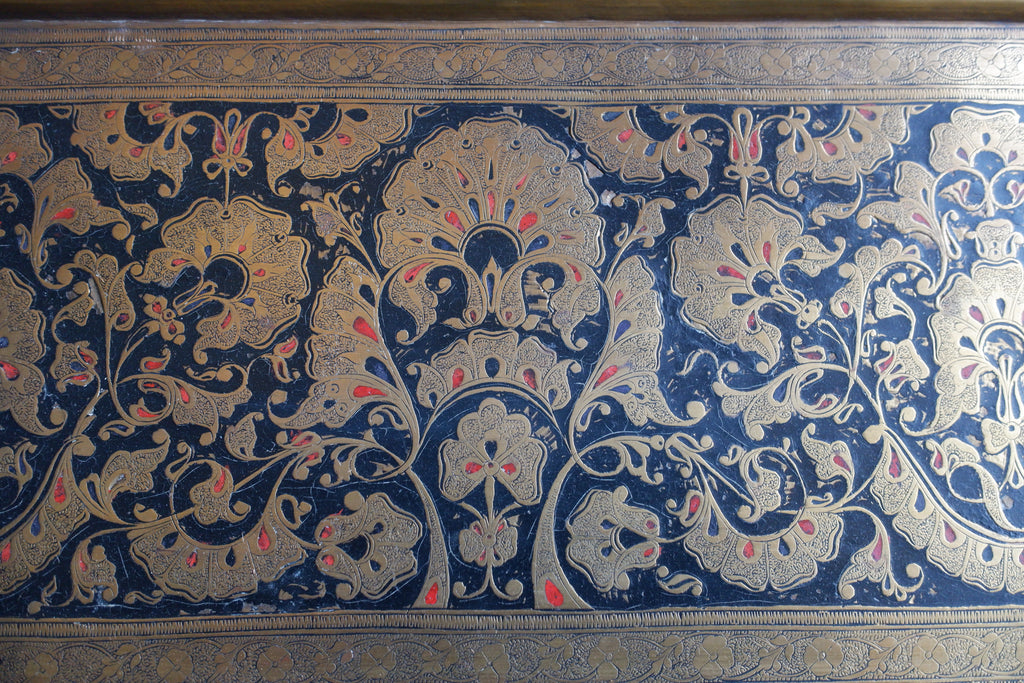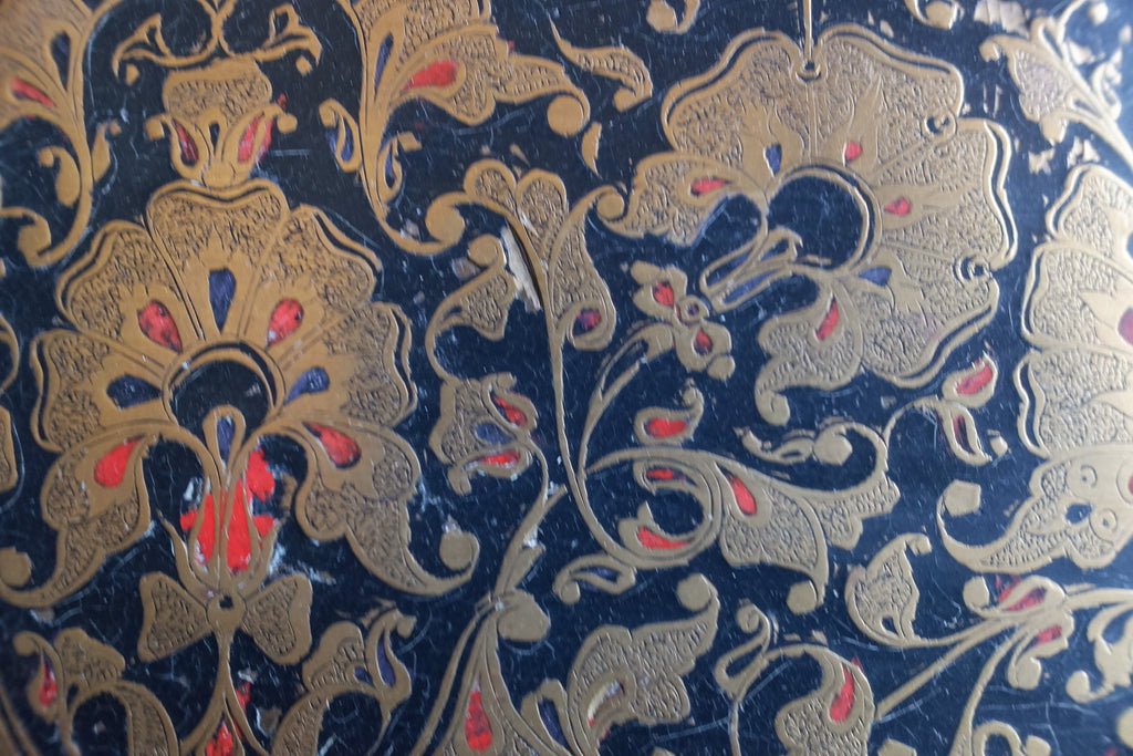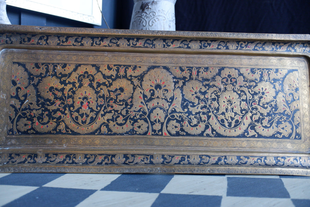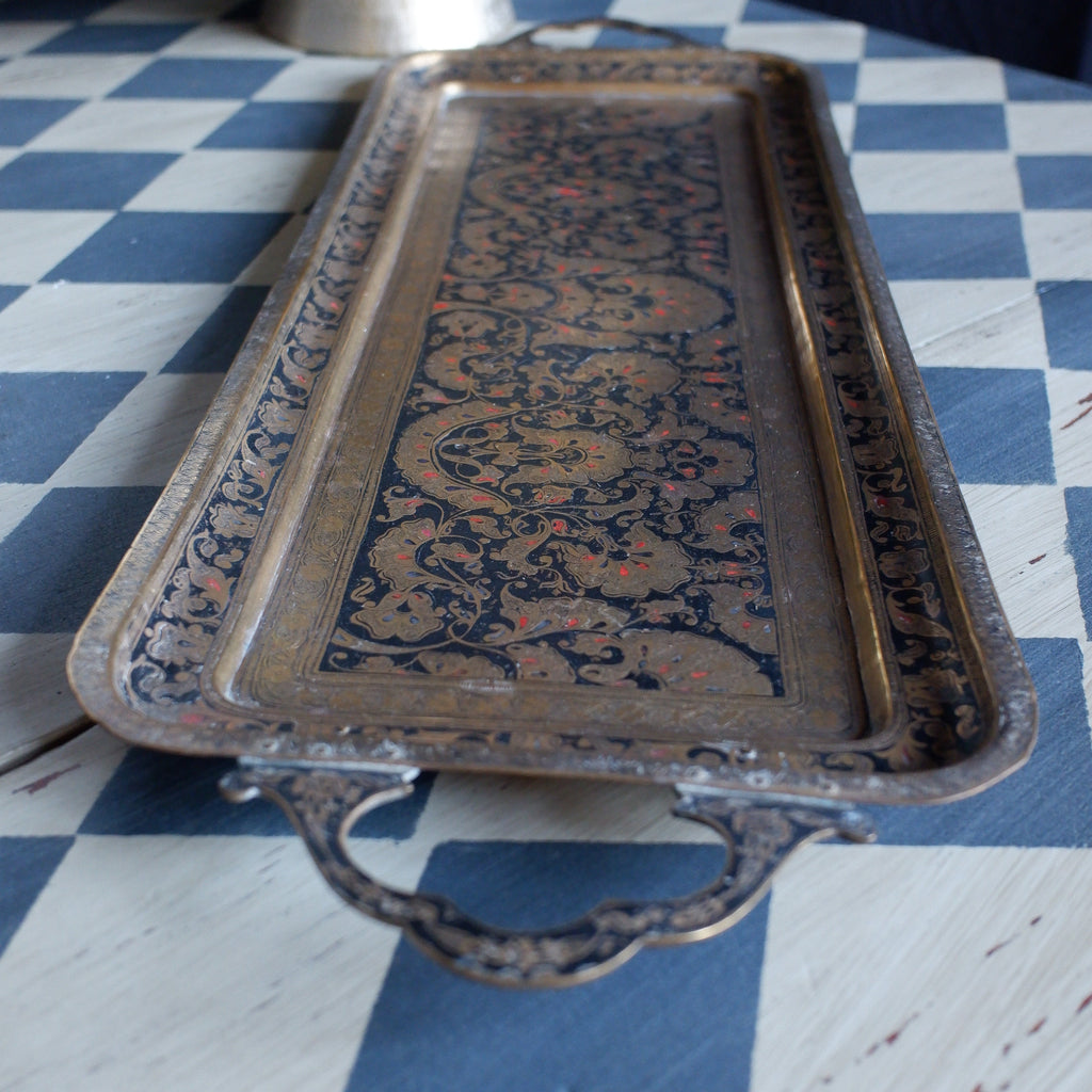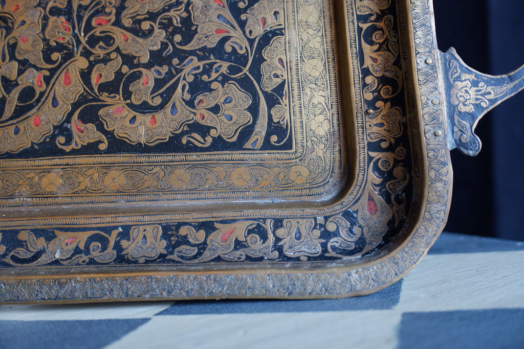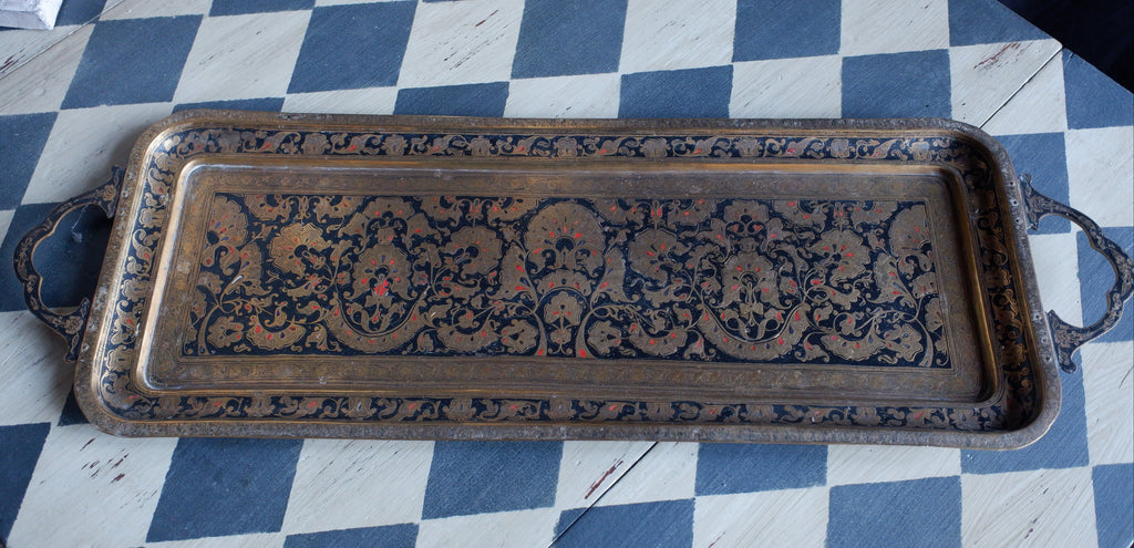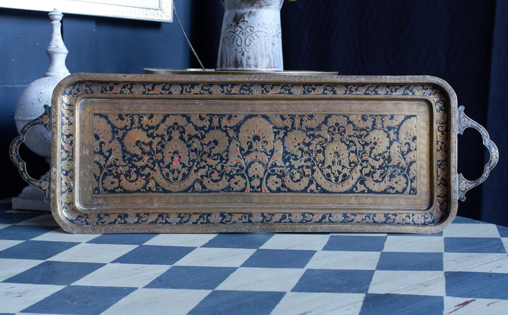 This rectangular brass tray brings authentic Indian artistry into your home. This is hand painted enamelled in red and black with traditional patterns, creating intricate designs across the surface. The solid brass construction develops a rich patina with age, adding to its warm character and rustic charm. Use it for serving tea and refreshments, displaying decorative objects, or as a striking wall accent.