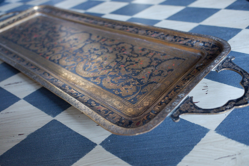 Antique Brass Indian Etched Serving Tray Decorative Metal Rectangular Display