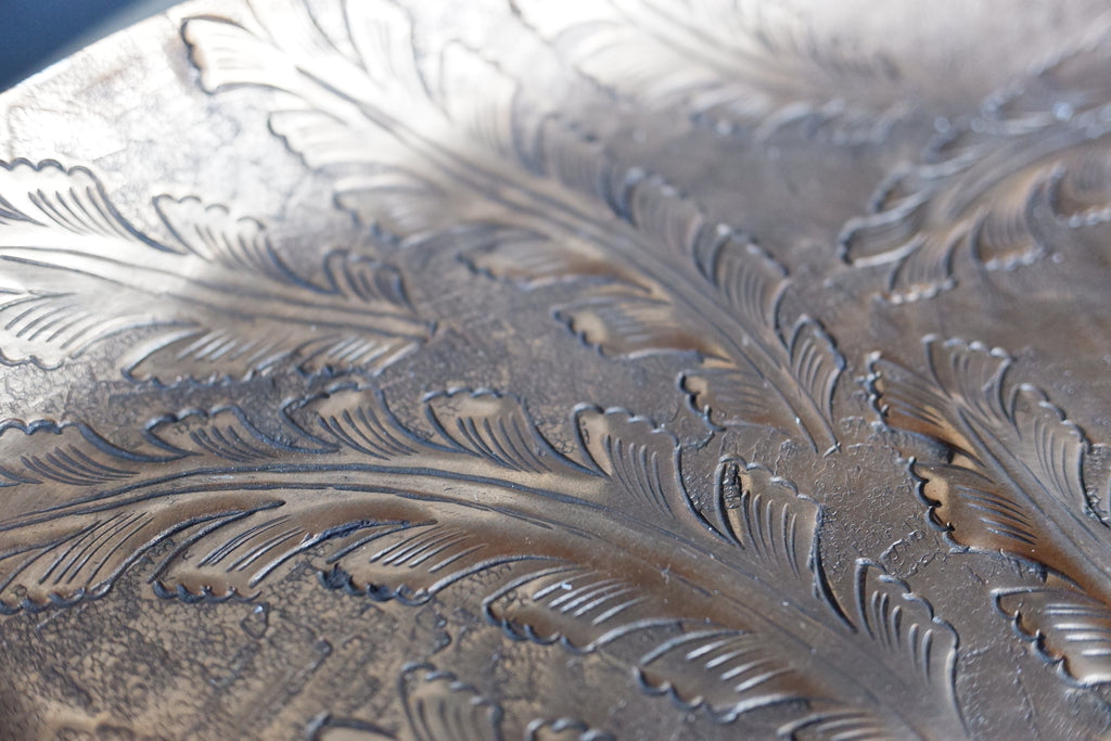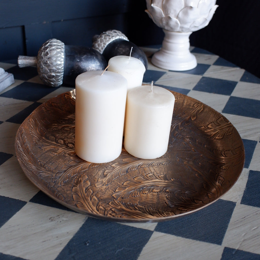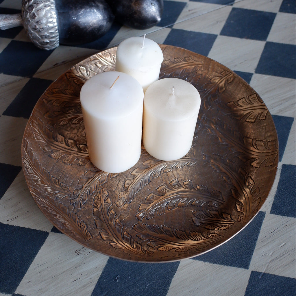 Elevate your table setting with this gold decorative tray, featuring an intricate embossed leaf design that captures timeless elegance.. Perfect for displaying candles, jewellery, or decorative objects, its refined aesthetic complements contemporary and traditional interiors alike. An ideal gift for those who appreciate curated home décor.
