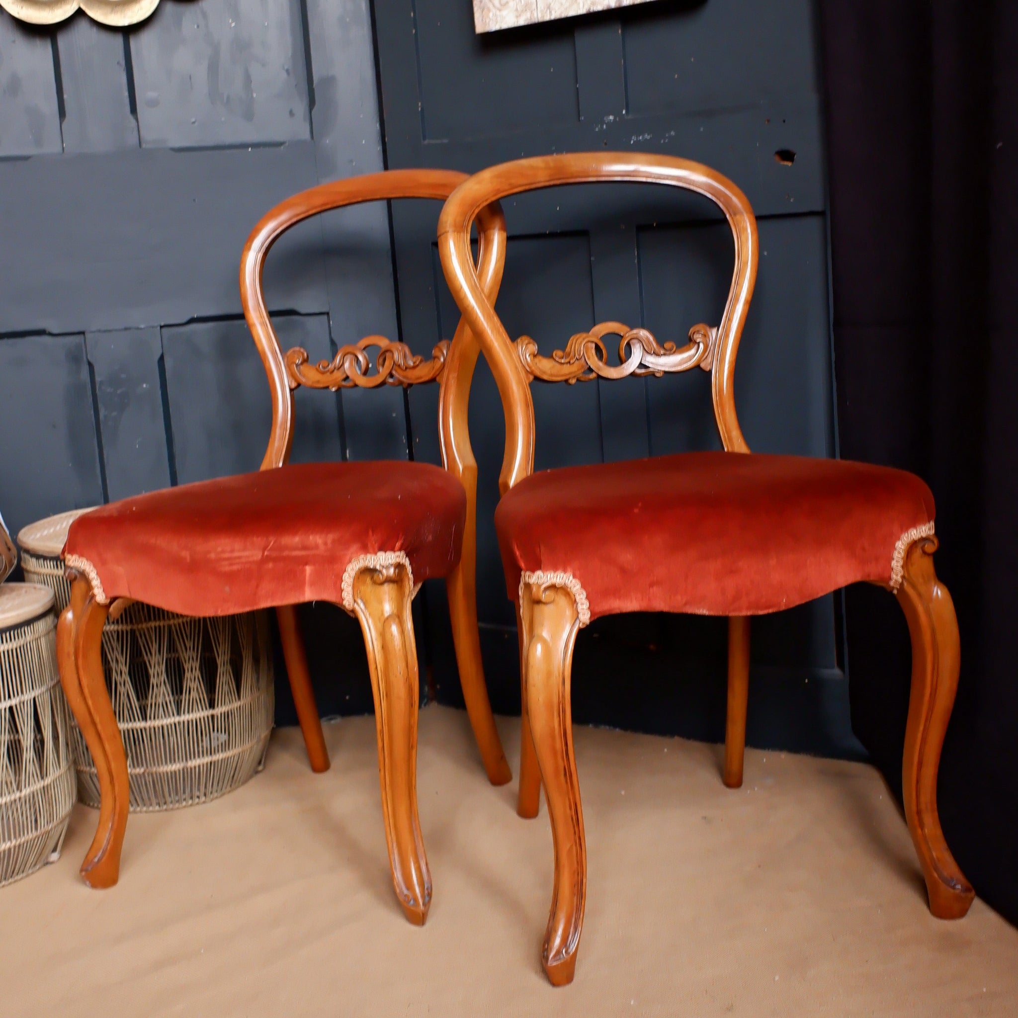 Pair of balloon back antique Victorian chairs in WALNUT with beautiful carved detail on the back, sitting on cabriole legs. They are in good condition with terracotta coloured upholstered seat.
