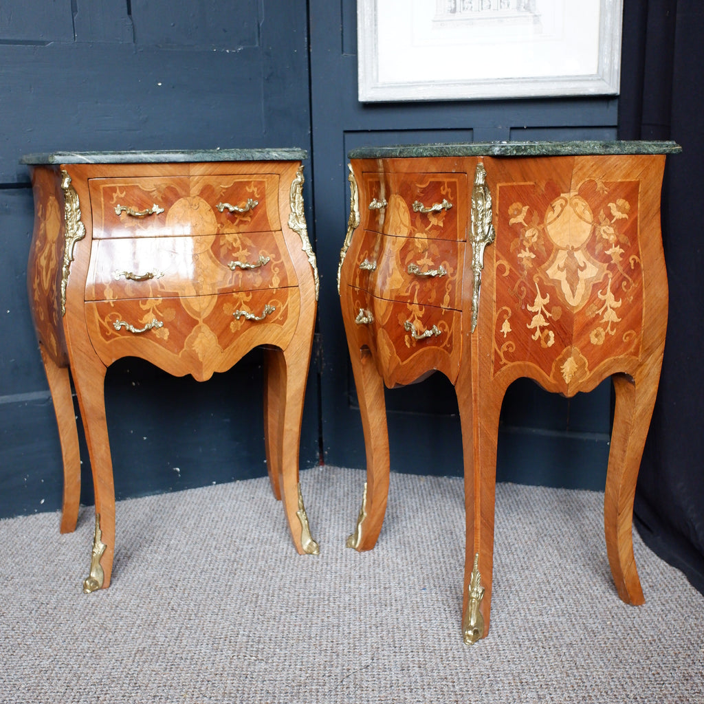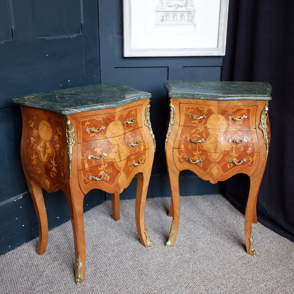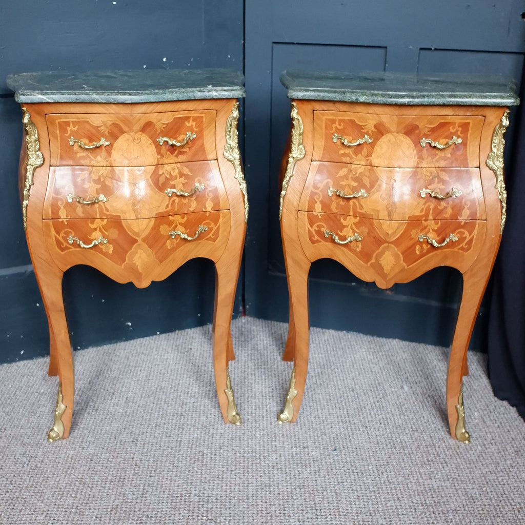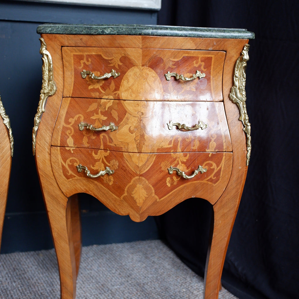 Pair of Vintage French Marble Inlaid Bombe Chest of 3 Drawers Lamp Table Bedside Cabinets