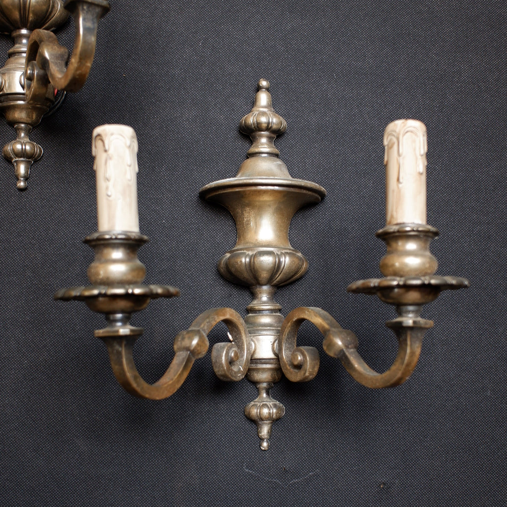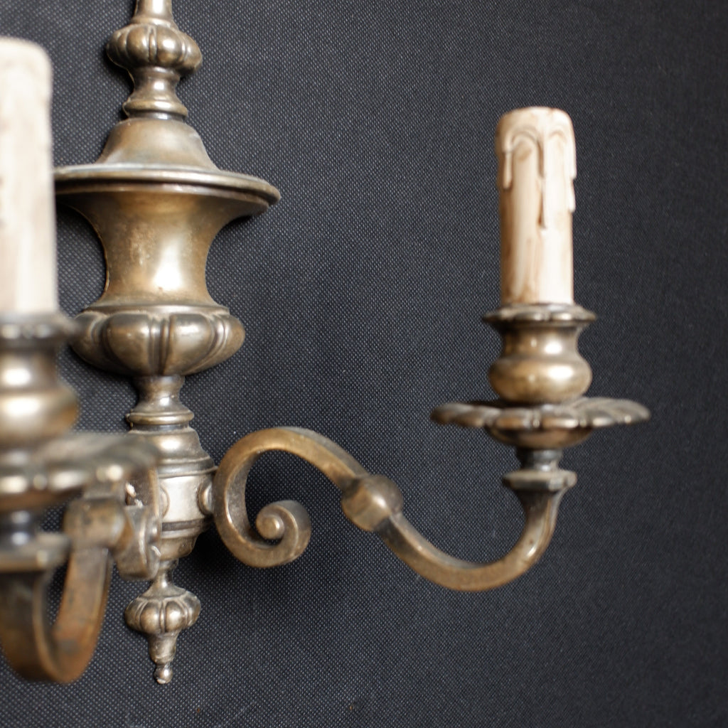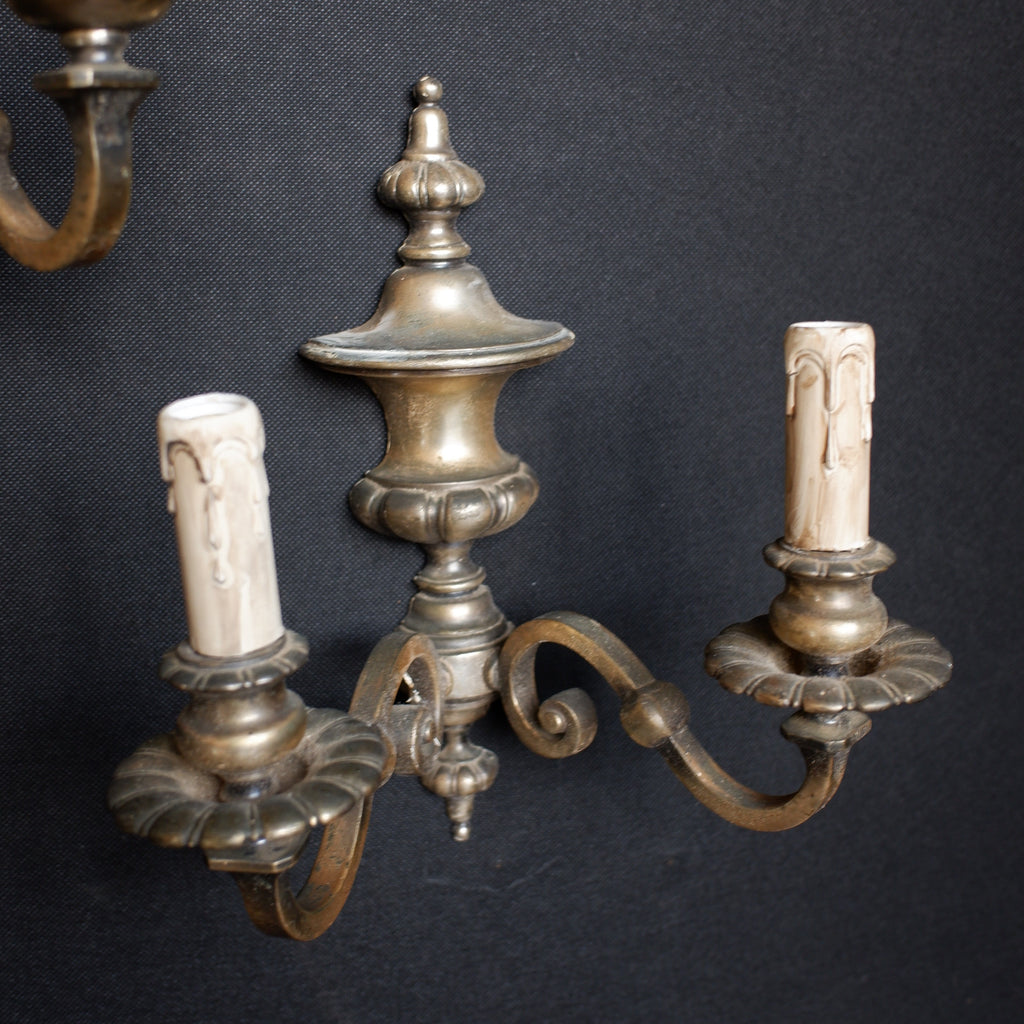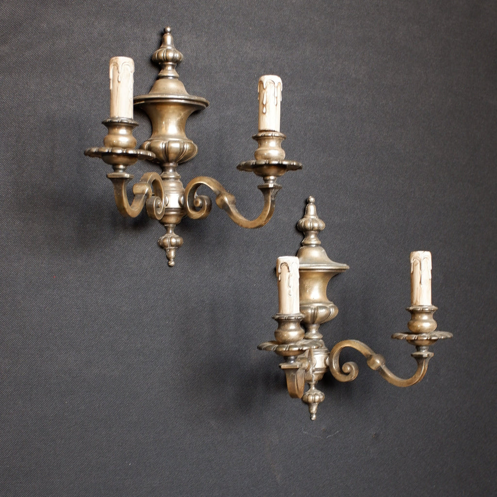 A classic pair of vintage French double arm wall lights in a Regency style. These come in an antique silver/pewter finish with scrolled arms and urn shaped detail on the base, good solid pieces.
