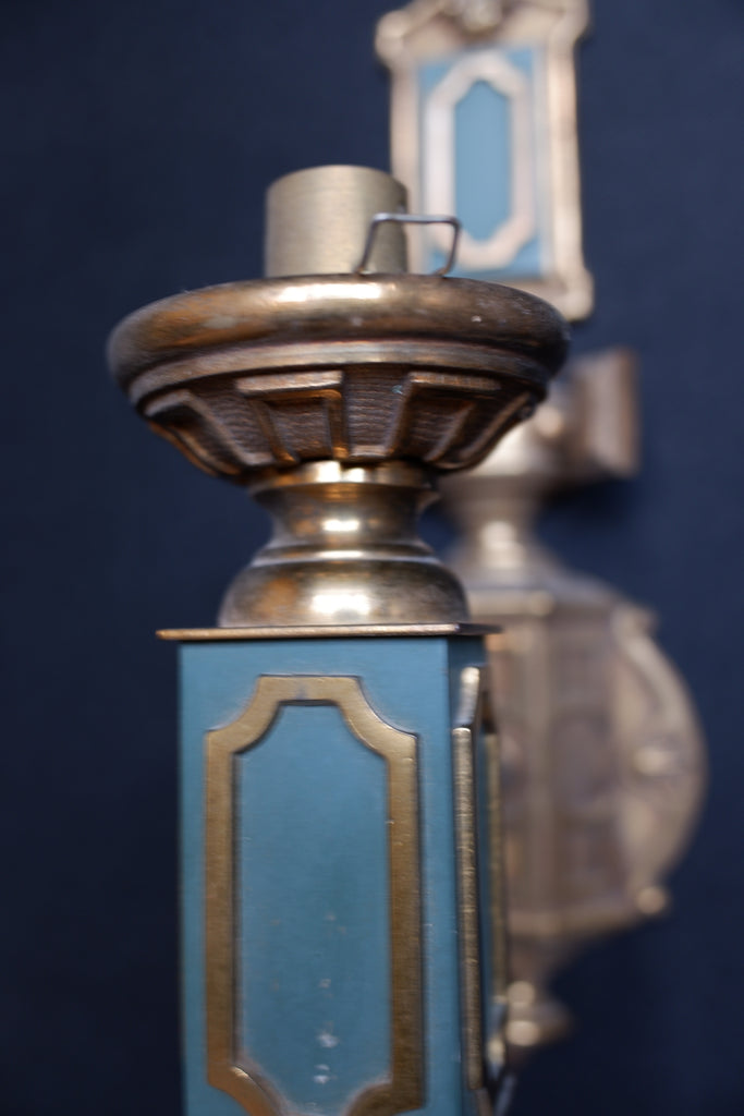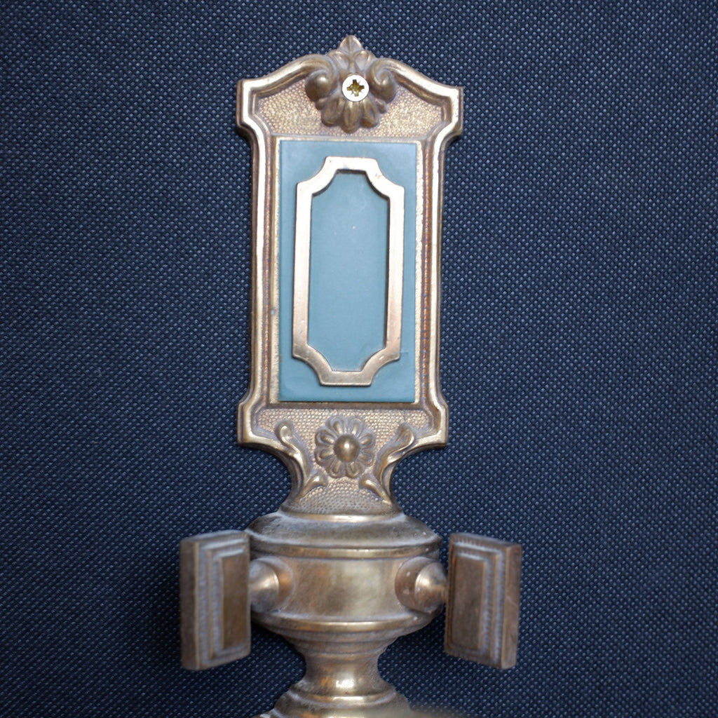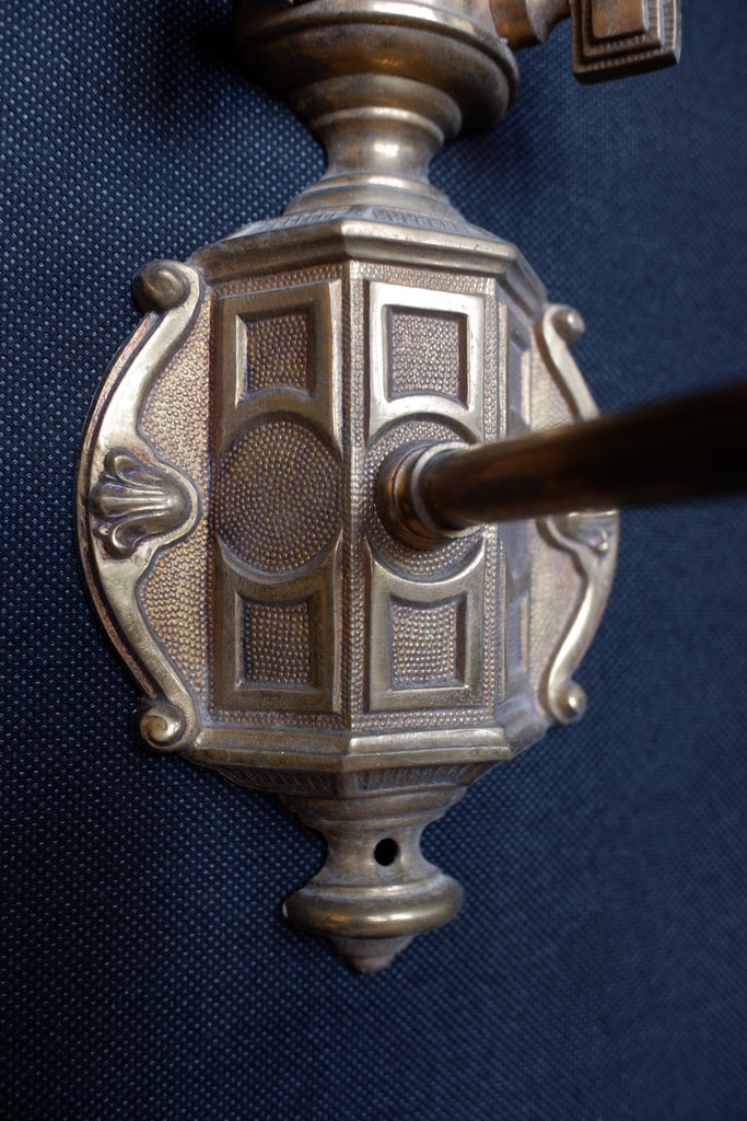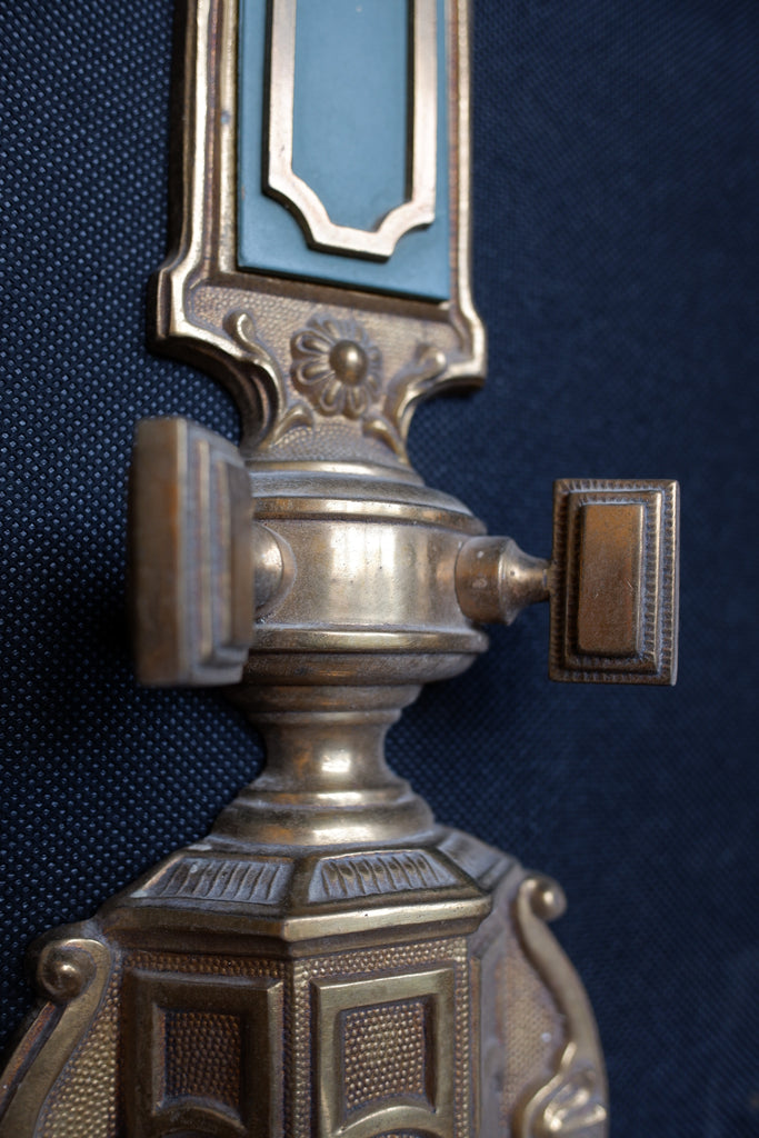 These exquisite set of wall lights capture the refined elegance of Georgian design with their ornate embossed detailing and rich colour palette. Crafted from solid brass, each piece features a distinctive gold finish complemented by rustic green accents, evoking the gas light aesthetic of the 18th century. The set of three provides versatile styling options for period properties, traditional interiors, or those seeking authentic vintage character. Perfect for hallways, living rooms, or feature walls.