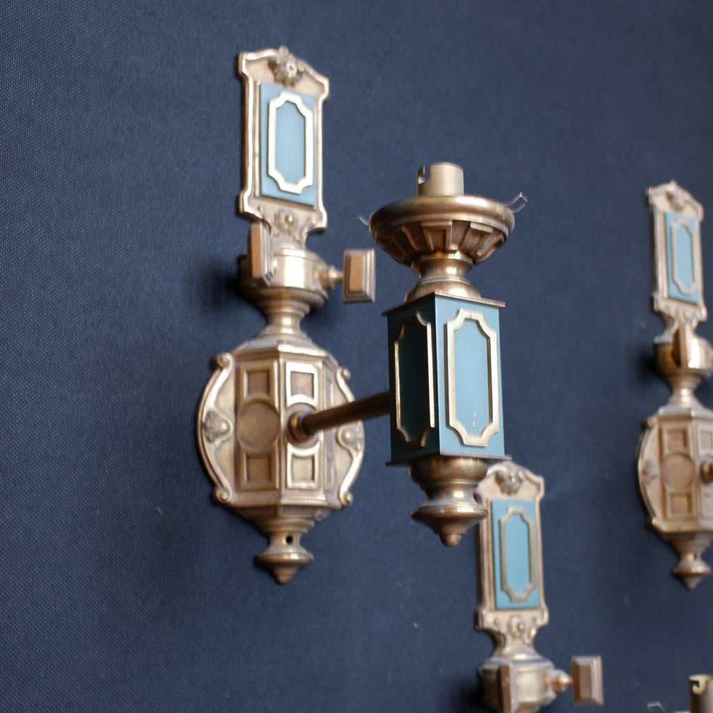 Set of 3 Georgian Style Vintage Brass Ornate Gold & Green Wall Lights Embossed