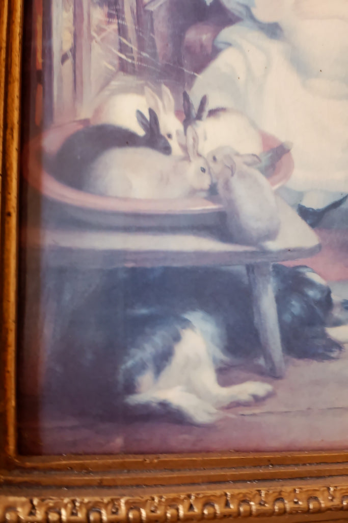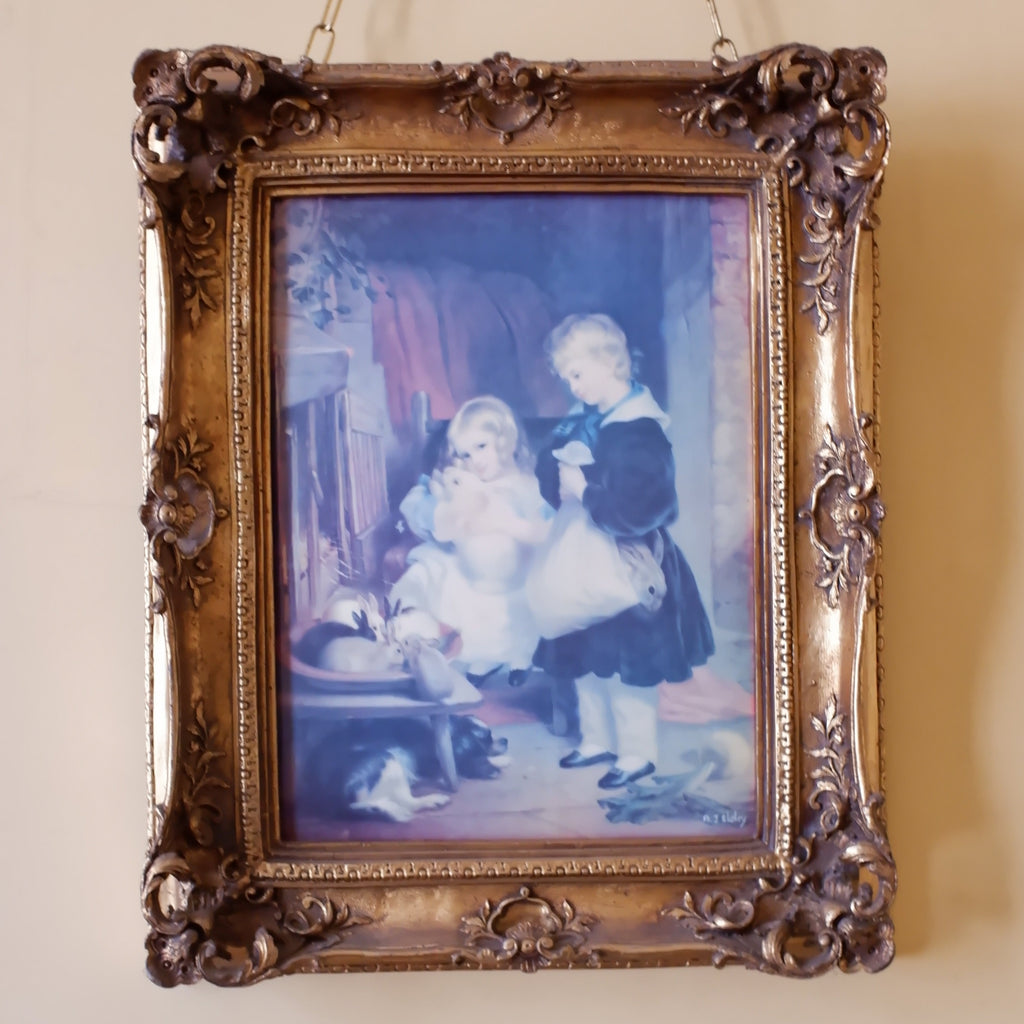 A beautiful vintage picture frame featuring young children with their beloved pets in a cosy home setting, signed AJ Elsley. Mounted on a ceramic base with an ornate gold-gilt frame, this charming piece captures nostalgic warmth and character. In very good condition for its age, it's an ideal addition to any interior seeking vintage charm and timeless appeal.
